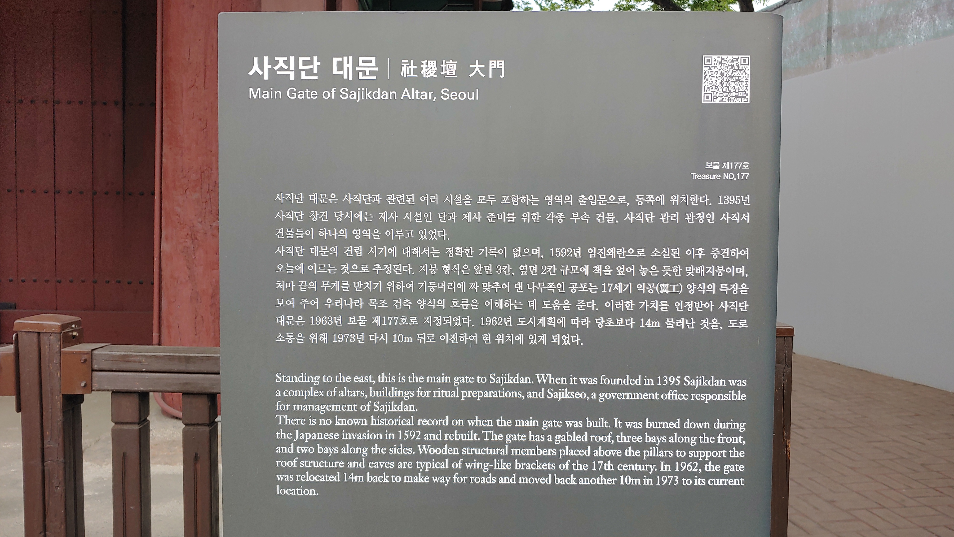 문화재 보호시설로 지정되어 있기 때문에 일반인의 직접 출입이나 왕래는 할 수 없고 대신 사직단 홍살문이나 돌담 너머를 통해서 제단의 모습을 볼 수 있다.(출처 : 위키백과)