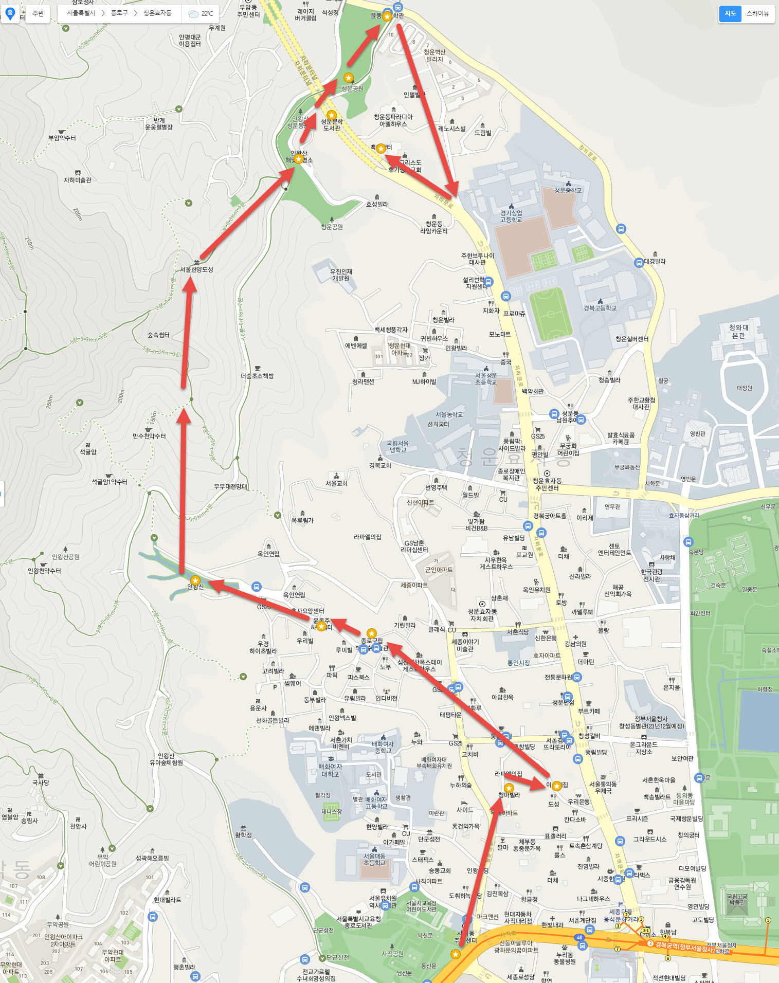 오늘 걸었던 경로를 지도에서 표시했다. 약 4시간 정도를 걷다 쉬다 했고, 약 15,000걸음을 걸었다.