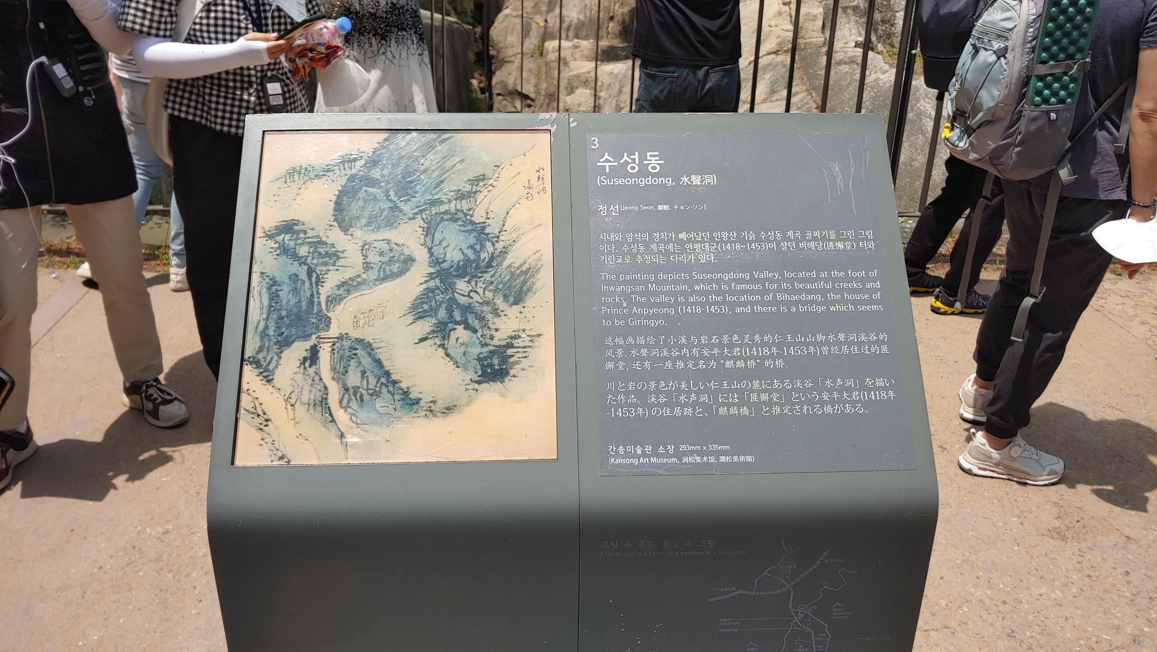 “수성동은 인왕산 기슭에 있으니 골짜기가 그윽하고 깊숙하여 시내와 암석의 빼어남이 있어 여름에 놀며 감상하기에 마땅하다. 혹은 이르기를 이곳이 비해당 터(안평대군 이용의 옛 집터)라 한다. 다리가 있는데 기린교(麒麟橋)라 한다.”