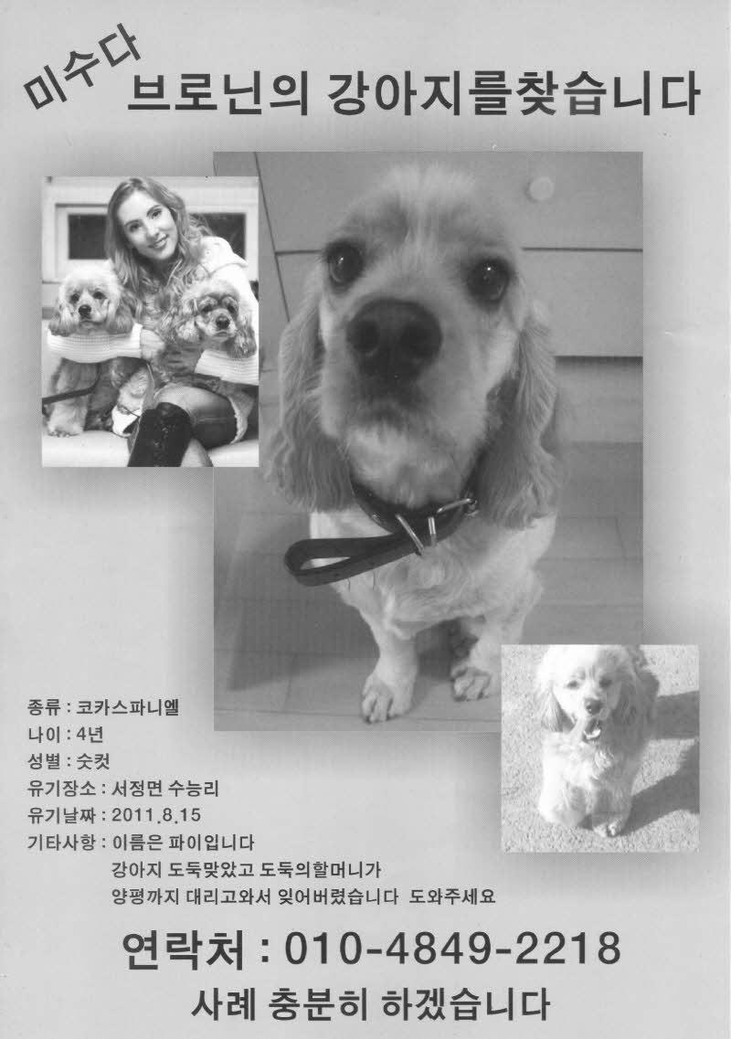 방금 브로닌 씨가 우리 집에 들렀다. 잃어버린 강아지를 찾고 있다는데, 그이의 정성이 갸륵하다. 그이가 가져온 전단지를 공개해서 많은 분들이 도움을 주셨으면 한다. 특히 양평에 사시는 분들은 관심 가져주시길...