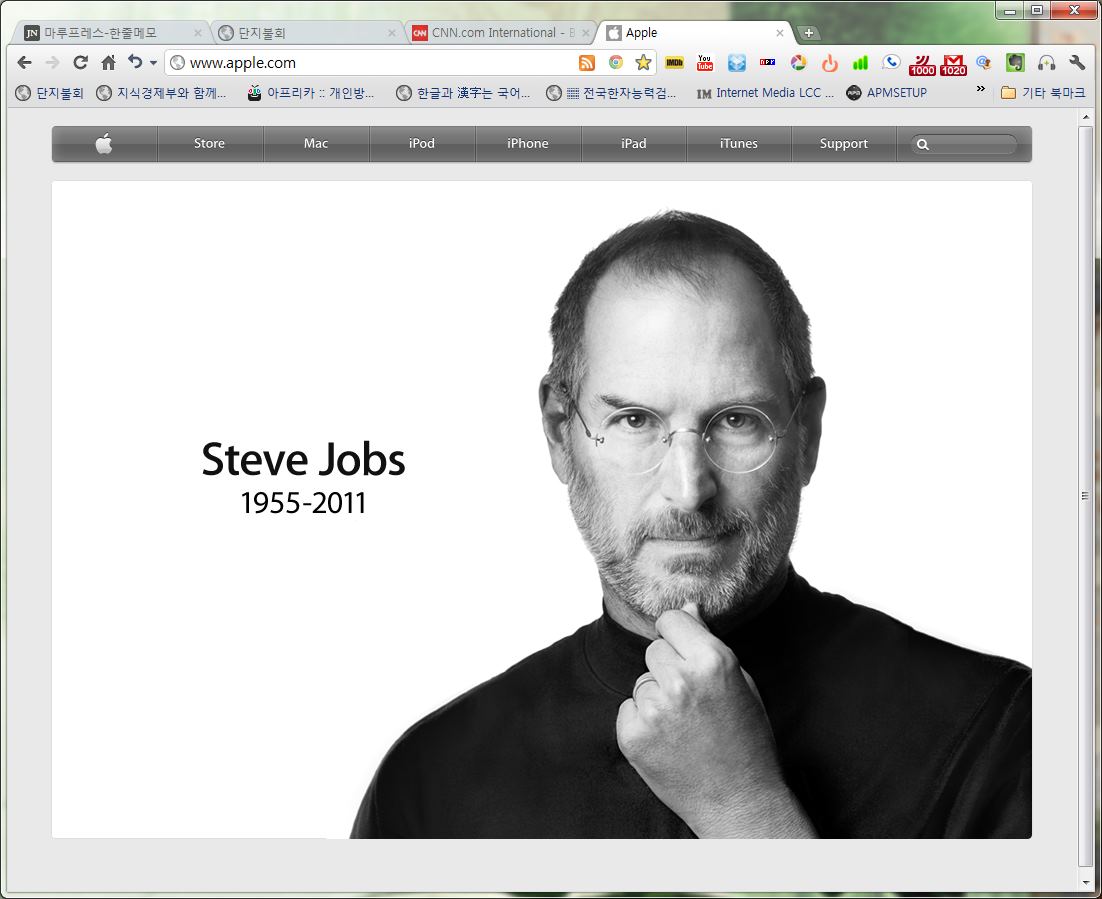 스티브 잡스. 인종과 국적과 언어가 다른, 개인적인 인연이 없는 분이지만, 당신의 기술과 디자인이 나에게 끼친 영향은 헤아릴 수 없을만큼 큽니다. 당신의 죽음으로, 현재 IT 기술 혁신은 한동안 멈출 것이고, 사람을 생각하는 혁신적인 디자인이 나올 때까지는 시간이 많이 걸릴 듯 합니다.