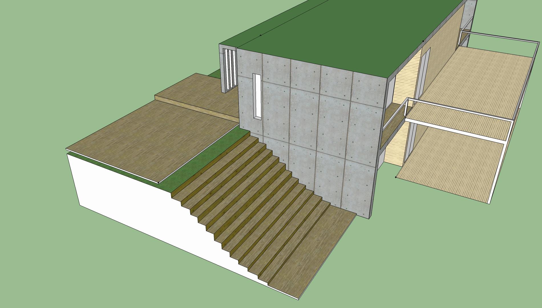 현관 앞에 데크를 깔기 위해 만들어 본 3D 모델링. 8.6미터와 4.6미터 넓이의 데크가 놓이면, 지금의 풀밭보다는 보기 좋을 듯.