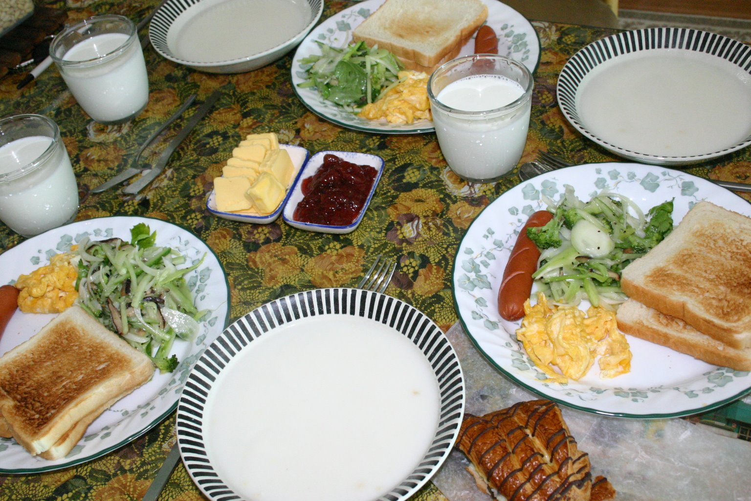 토스트와 우유. 버터와 딸기잼. 소시지, 달걀부침, 샐러드. 간단한 듯 하지만, 사실 간단하다. ^^